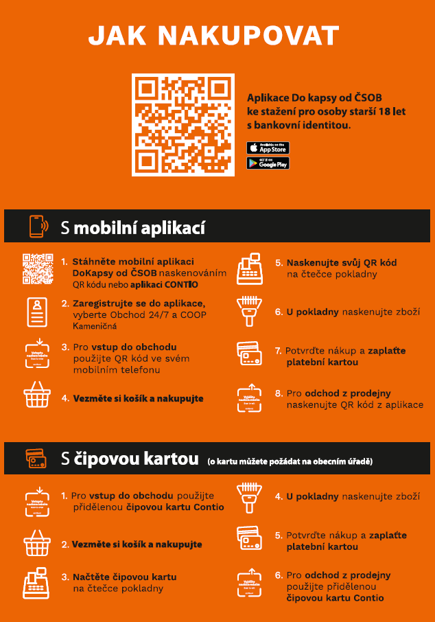 přičemž vstup do prodejny je možný pouze s mobilní aplikací nebo s čipovou kartou, která bude k vyzvednutí na obecním úřadě od středy 8.4.2026 od 15:00 hodin.